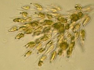 Another group of algae known as diatoms are really neat organisms. They often appear goldish, gray, or yellow-green in color. That's because they have a pigment called fucoxanthin. And diatoms, interestingly, often look like little pieces of glass because they have silica in their cell wall. They’re a very common group and they may cause your water to look turbid or brown in color, but it’s not always as bad as the other types.